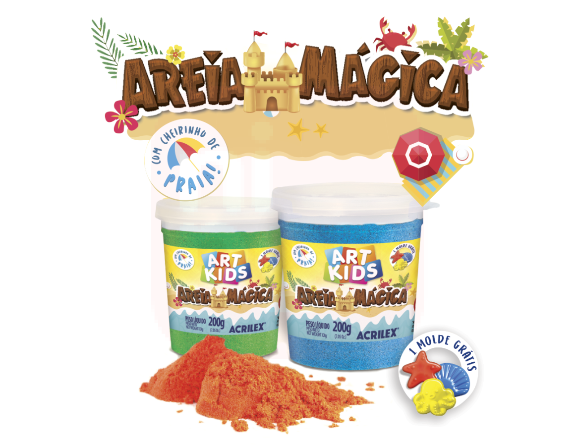 Areia Mágica Natural - areia - 200g - A Areia Mágica 550g e 200g proporciona as crianças, uma incrível experiência sensorial, desenvolve a coordenação motora, habilidades manuais e a criatividade. Vem com uma forminha com tema praia para modelar. Características Gerais do Produto: • EAN: 7891153099750 • Marca: Acrilex • Idade recomendada: 3 anos e acima • Dimensões: 8 x 7,5 cm Acompanha o produto: • 1 unidade de Areia Mágica com 1 molde. Garantia: • Sem Garantia